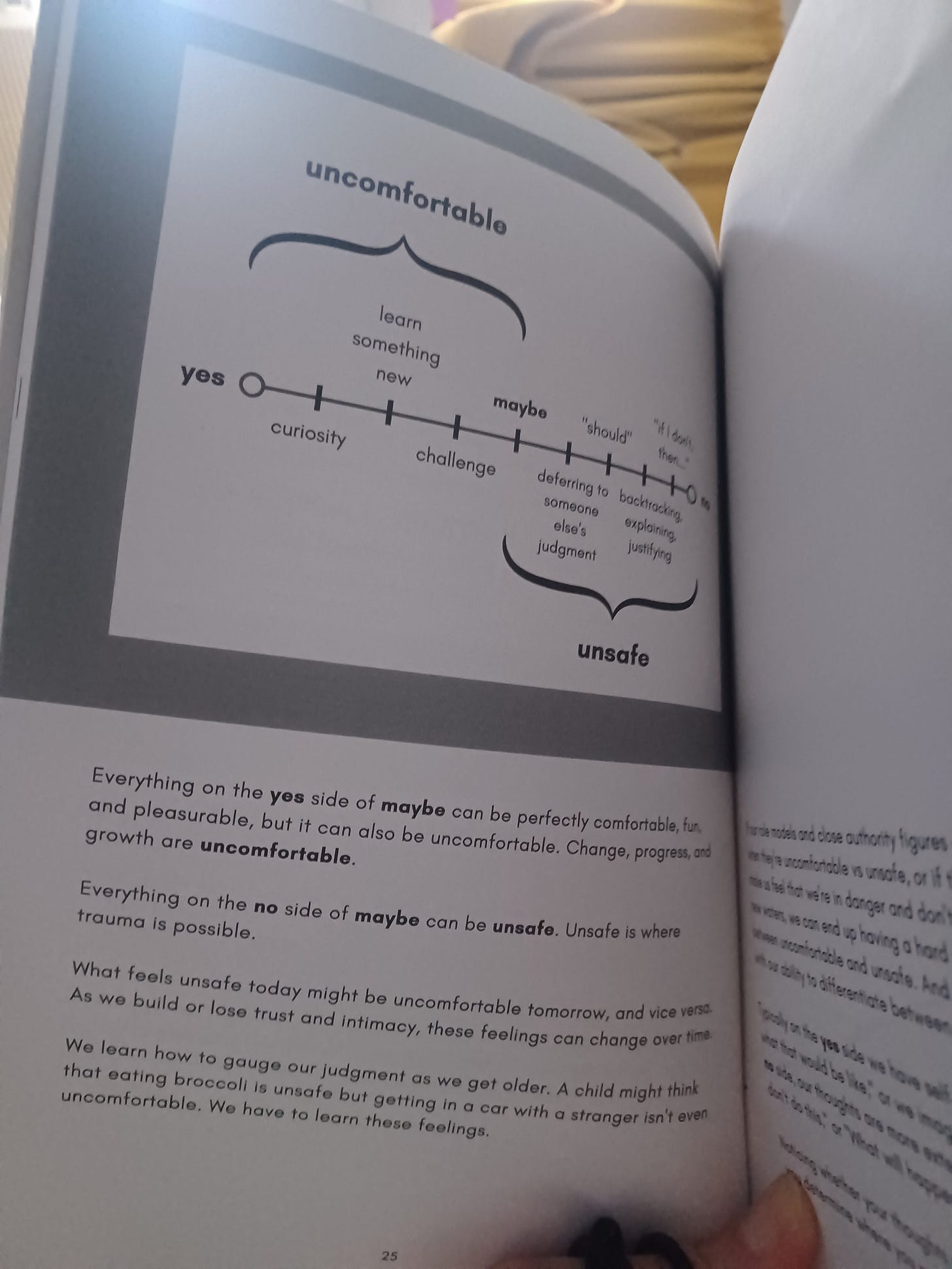 “Our bodies know before our brains do, but we listen more intently to our brains because our brains speak the same language we do,” Mia Schachter says. “This is really important in terms of the Yes-to-No Spectrum and making sure that you’re moving through that No side with care, as well as differentiating between what is uncomfortable and what is unsafe. Avoiding what’s uncomfortable prevents growth, but often it’s hard to distinguish what’s merely uncomfortable from what’s truly unsafe due to trauma, past experiences, and conditioning. When we can move slowly and be in conversation with our body as it tells us no, we can begin to explore the things that our body mistakes for unsafe and move through discomfort in order to expand what’s possible.”